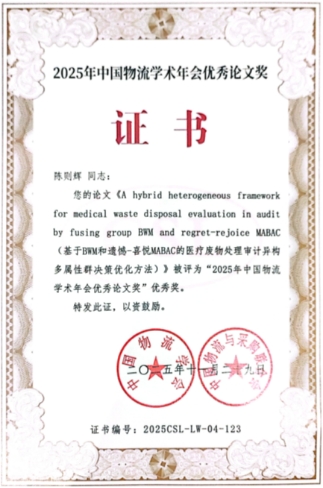 2025年11月28-30日,由中国物流学会、中国物流与采购联合会主办的2025年(第二十四次)中国物流学术年会在湖北武汉顺利召开。管理学院物流管理教研室杜艳和陈则辉两位受邀参会,其中陈则辉老师提交的学术论文凭借突出的创新性与实用性,在众多参评成果中脱颖而出,荣获本次物流学术年会优秀论文奖,充分展现了我院教师在物流管理研究领域的扎实功底与创新能力。