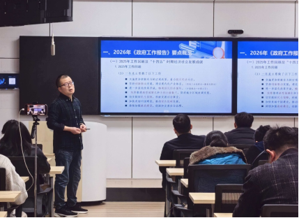 随后,任高飞博士以《2026年全国两会精神解读与经管类科研选题前瞻》为题作专题辅导。他系统梳理2026年《政府工作报告》核心要点,全面回顾2025年经济社会发展成就与“十四五”时期发展成果,深入解读“十五五”时期主要目标、重大任务及2026年经济社会发展总体要求、政策取向与重点工作任务。同时,任高飞博士聚焦两会热点与高频关键词,围绕新质生产力、全国统一大市场、绿色转型等关键内容,结合经管学科特点,从选题原则、方向建议、研究方法等方面,为全院教师提供科研选题思路与实践路径,内容兼具理论高度、政策精度与学科深度。